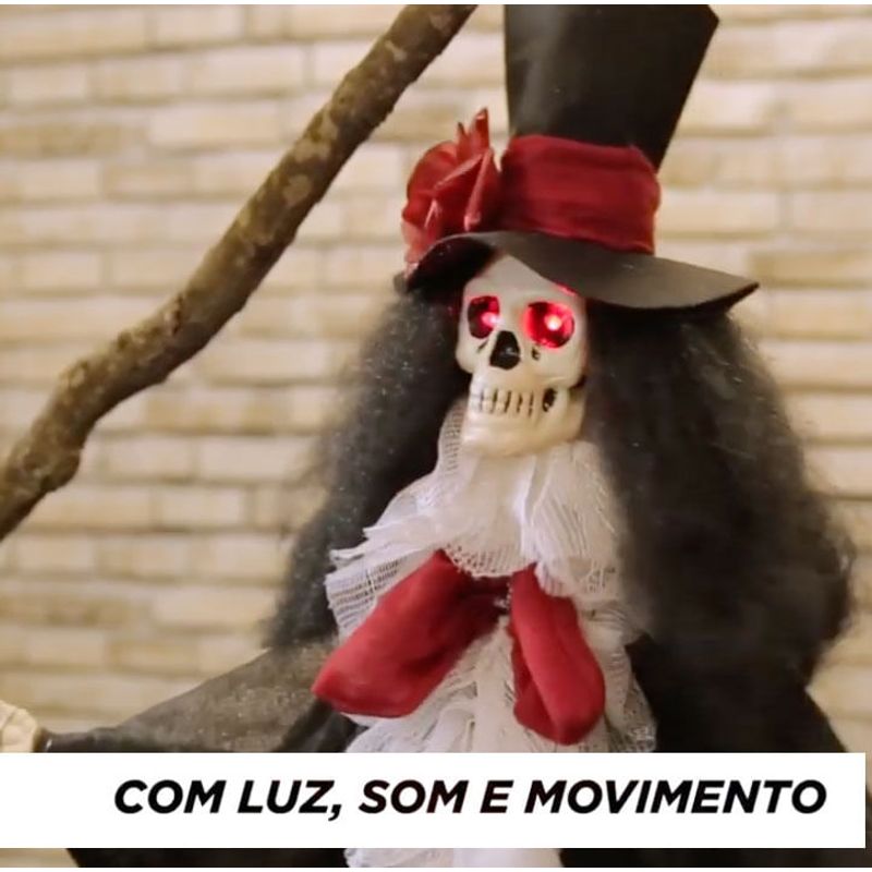 Com um chapéu imponente, luzes de led que iluminam seu rosto cadavérico e movimentos sinistros, este boneco cria um ambiente sombrio e cheio de mistério. Além disso, ele emite sons assustadores que vão deixar sua decoração ainda mais autêntica.