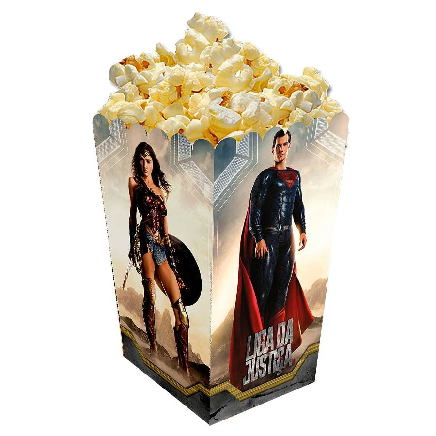 Produzida em papel cartão, cada pacote contém 08 unidades da Caixa Americana para Pipoca Liga da Justiça. As dimensões de cada caixa são 10cm de altura x 07cm de diâmetro (boca) e 05cm de profundidade (fundo).