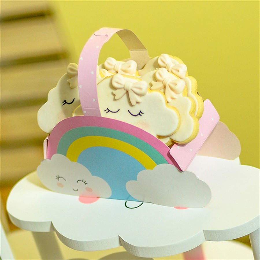 Produzido em papel cartão de alta resistência com estampa Chuva de Amor.