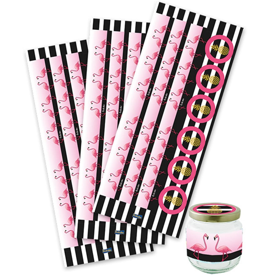 Deixe sua festa ainda mais divertida com o Kit Adesivo Let's Flamingo para 18 Potinhos. Com adesivos ilustrados e criativos, é possível decorar seus potinhos com facilidade, trazendo um charme especial para sua celebração. O kit conta com 18 adesivos temáticos no estilo flamingo, perfeito para festas de aniversário, chás de bebê, entre outros eventos. Cada adesivo mede 8 cm x 3,5 cm.