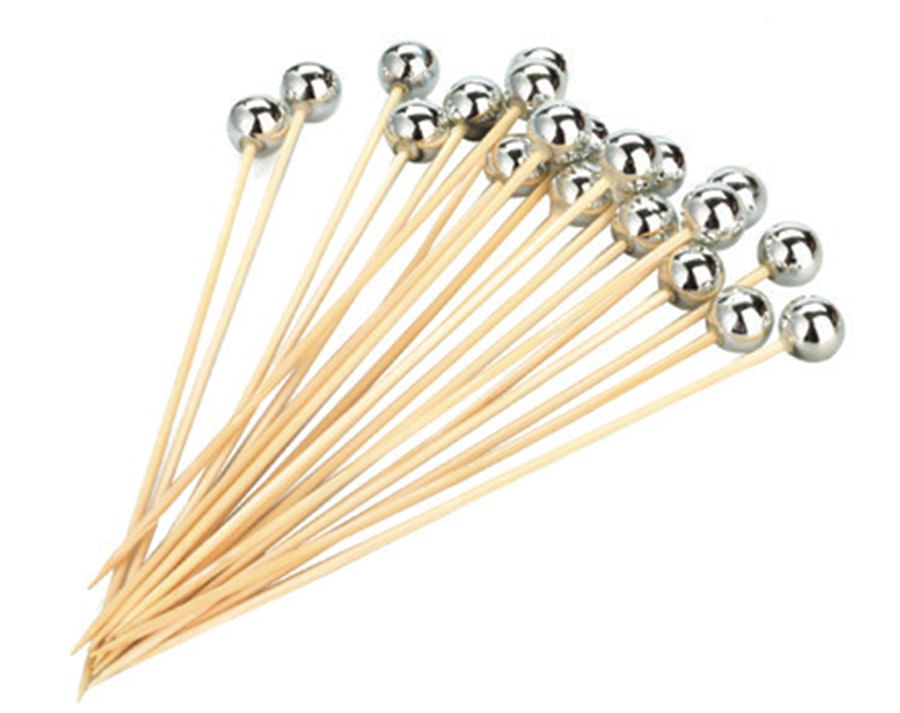 Palito em Bambu Para Petiscos 12cm Bolinha Metalizada Prata - 20 Unidades