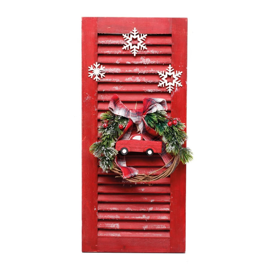 Cromus - Quadro decorativo formato janela veneziana vermelha com flocos de neve e guirlanda verde com laço xadrez e caminhão.
