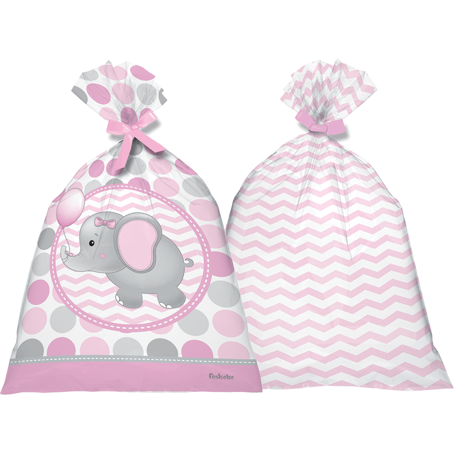 08 unidades da Sacola Plástica Elefantinho Rosa, com 25cm de Altura e 14,5cm de Largura cada.