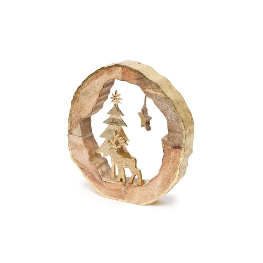 Adicione um toque natalino à sua decoração com o Tronco em Madeira com Rena e Pinheiro Ouro M. Medindo aproximadamente 34 cm de altura, 31 cm de largura e 5 cm de comprimento, é confeccionado com 50% madeira e 50% metal. Limpe-o facilmente com um espanador.