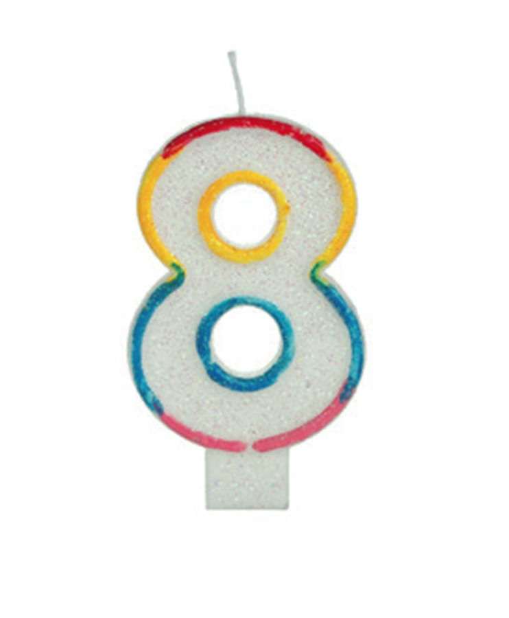 A Vela Big Glitter Borda Colorida Número 8 é vendida em pacotes com 1 unidade.