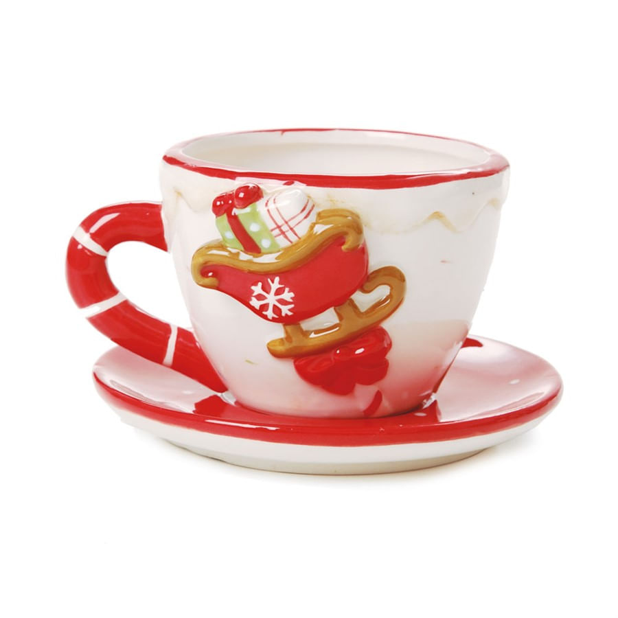Compre agora Xícara e Pires com Trenó Vermelho e Branca (Candy Cane) - 4 un e deixe sua festa ainda mais bonita e temática. Produto importado em cerâmica. Ideal para chá de Natal, ou uma decoração temática de Natal.