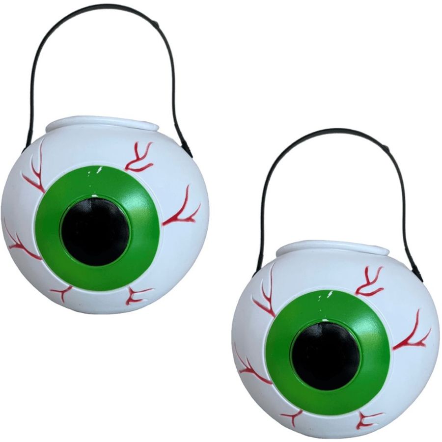 Design Criativo: Com formato de olho, este balde se destaca como um acessório de decoração exclusivo para festas de Halloween.