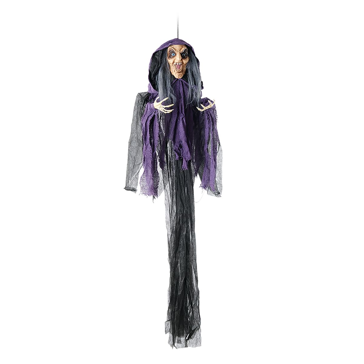Fabricada com materiais de alta qualidade, a Bruxa Elvira possui uma estrutura resistente composta por 65% poliéster, 30% plástico e 5% fio de ferro. Seu acabamento detalhado e colorido confere um aspecto realista e cativante, tornando-a uma peça central na decoração de festas temáticas de Halloween.