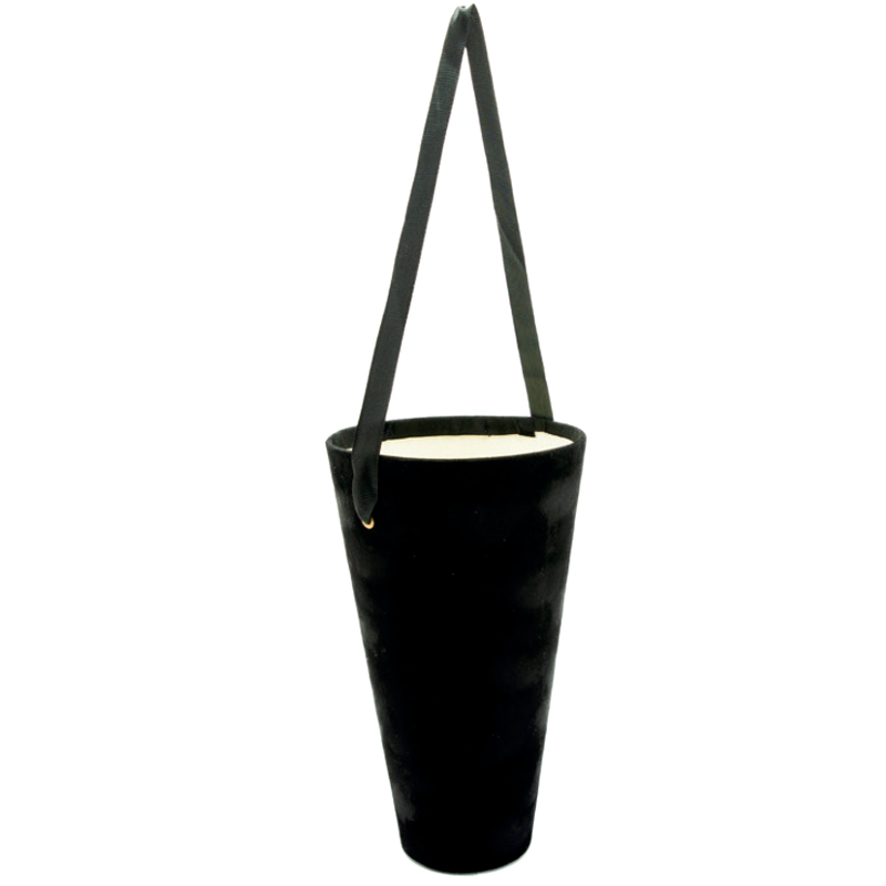 Caixa cilíndrica em veludo preto, que oferece um toque sofisticado para armazenamento ou presente.