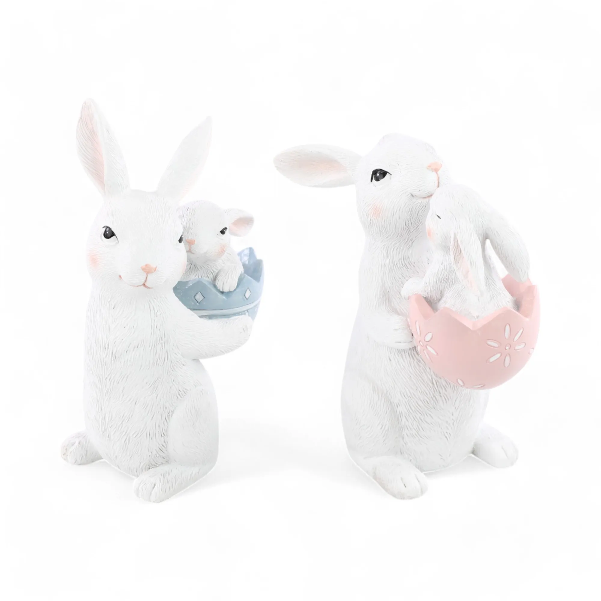 Coelho carinhoso de resina com filhotes, trazendo um ar acolhedor e alegre à decoração.