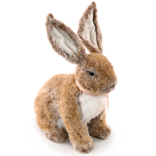 Coelho de tecido sentado, decorado com laço e arranjo de pão mel.