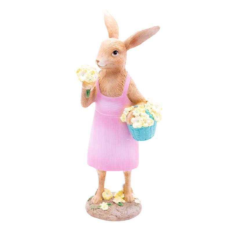 Design encantador: com sua cesta e buquê de flores, o coelho traz um toque de elegância e delicadeza à sua decoração de Páscoa.