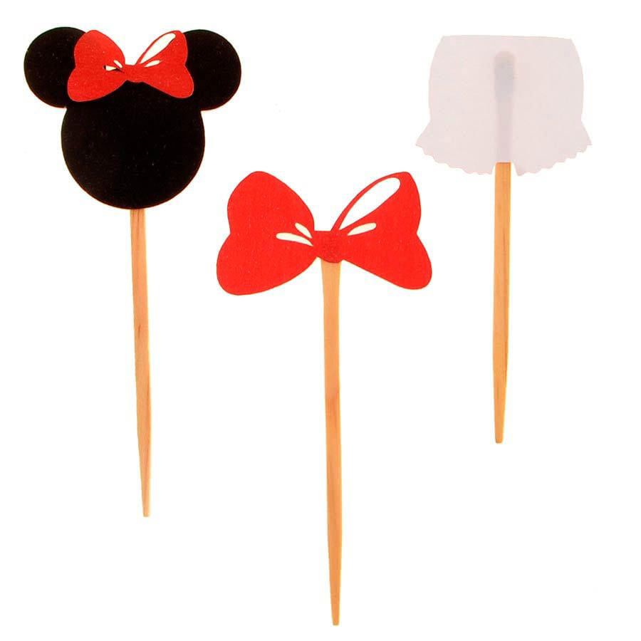 Esse enfeite conta com palitos em madeira e figuras em papel colorido recortado, representando a adorável personagem Minnie Mouse. A embalagem contém 06 unidades, proporcionando uma decoração encantadora para seus doces.
