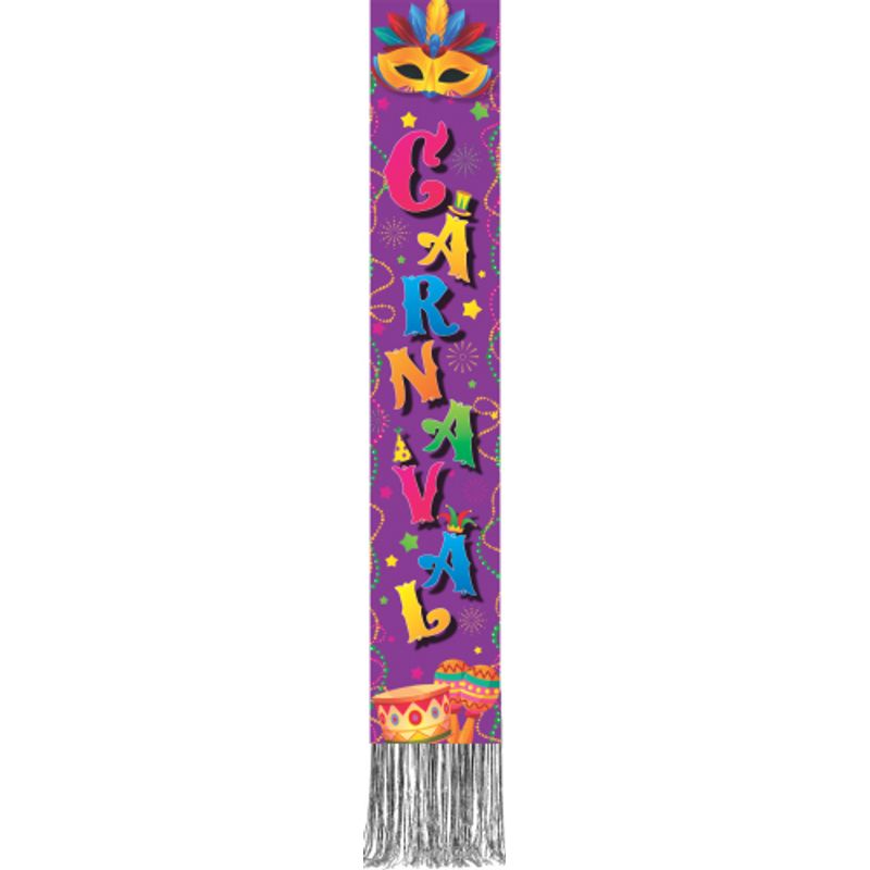Utilize a Faixa Vertical Roxa Carnaval com Fitilho para decorar paredes, portas ou balcões, criando um ambiente temático e divertido para sua festa de Carnaval.