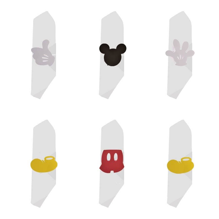 Disponha os Porta Guardanapos Mickey Mouse ao redor dos pratos dos convidados, utilizando a fita para amarrar os guardanapos e prendendo a figura do Mickey Mouse na ponta.