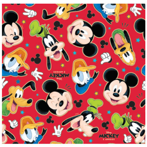 Folha poliéster licenciada com estampas de Mickey Mouse, ideal para festas infantis.