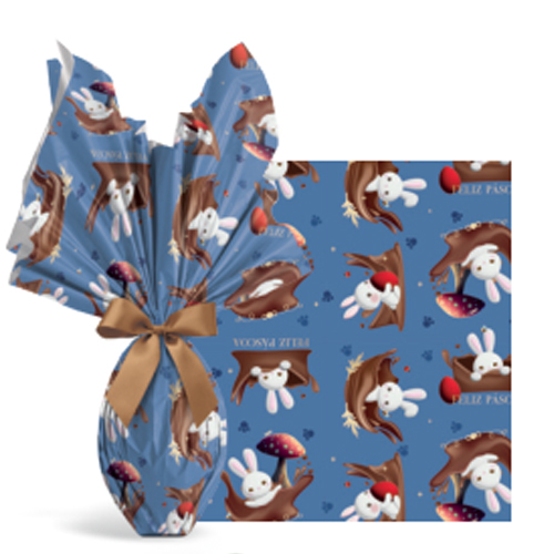 A folha poliéster metalizada azul é ideal para criar embalagens que destacam a alegria da Páscoa, com um design que encanta a todos.