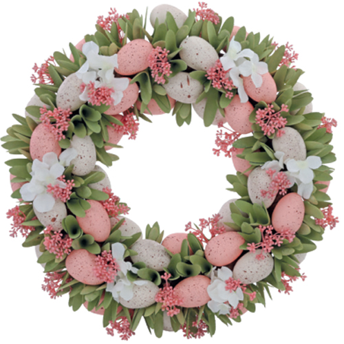 Guirlanda decorativa com ovos e flores em tons de rosa, uma escolha lindíssima para a época da Páscoa.
