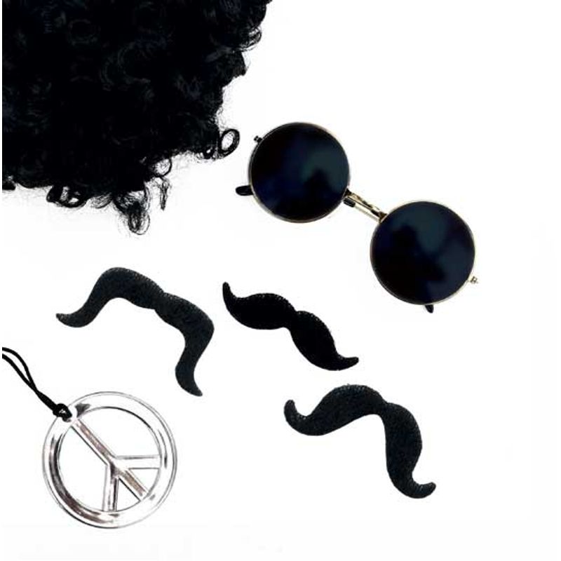 Use o Kit Black Power Hippie Adulto - 6 Acessórios para compor uma fantasia completa de hippie, combinando-o com roupas coloridas, calças boca de sino, batas e lenços no cabelo.