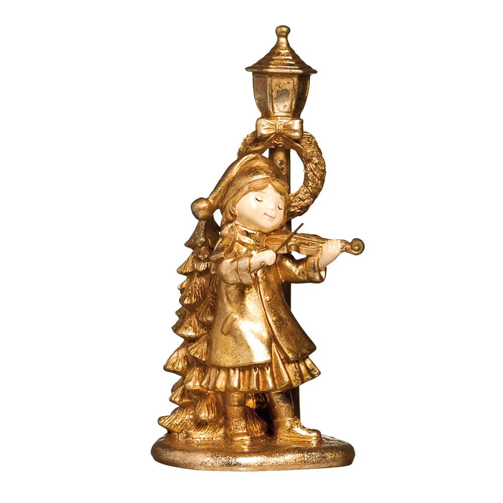 Crie cenários encantadores: Utilize a Menina com Violino Ouro como parte de um cenário encantador, com tecidos, iluminação adequada e outros elementos decorativos que valorizem a peça.