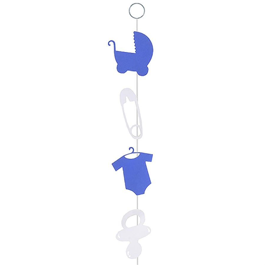 O Móbile Artesanal Chá de Bebê Azul 80cm é o item perfeito para decorar o teto, as portas, as mesas e trazer charme ao tema do Chá de Bebê Azul. Feito com fita de cetim branca e figuras médias do tema na vertical, este móbile vai adicionar um toque especial à sua festa.