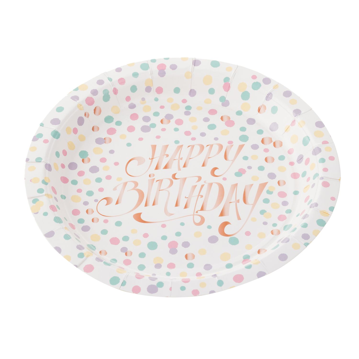 Com um design encantador e colorido, este prato de papel é perfeito para decorar a mesa dos parabéns. Sua estampa vibrante com a mensagem "Happy Birthday" em destaque traz um clima festivo e descontraído.