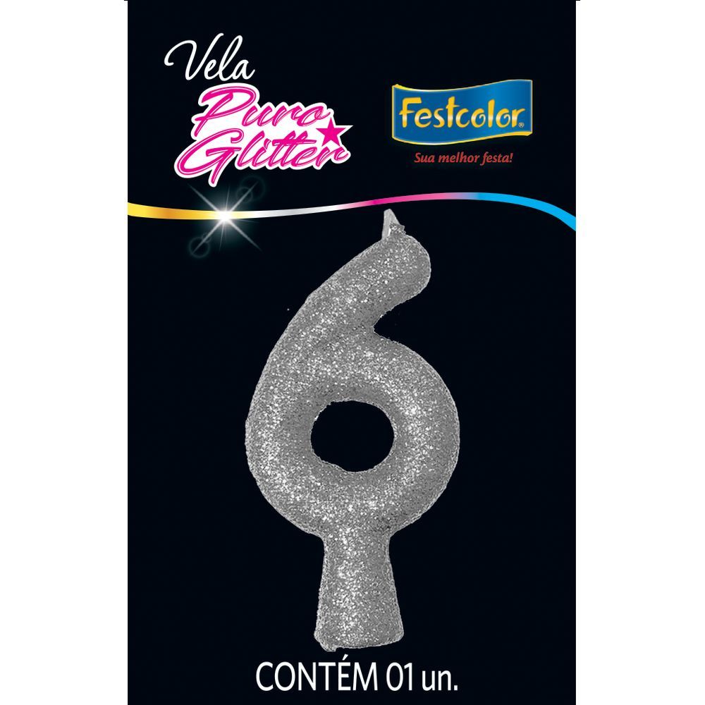 Vela Puro Glitter Prata Nº 6 - Festcolor - 1Un - Festcolor